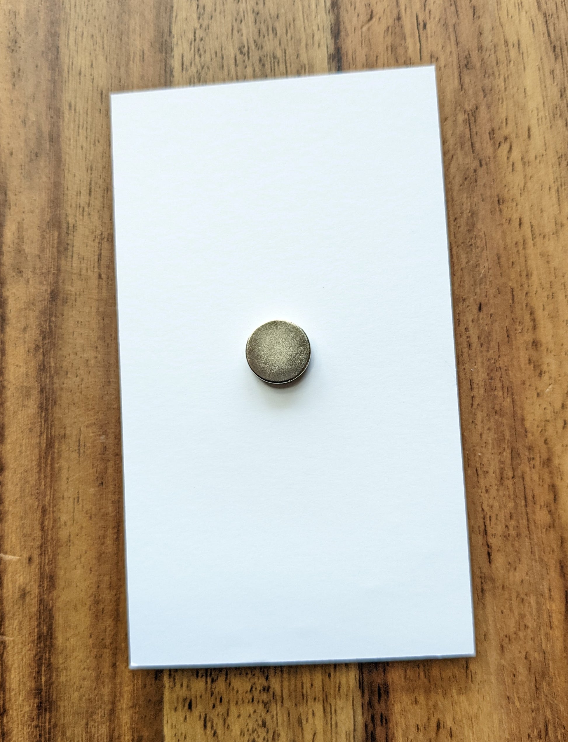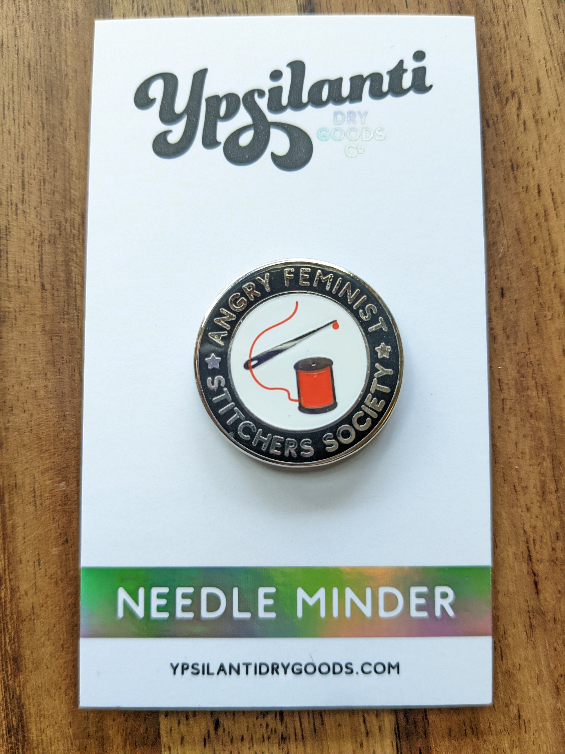 This clever needle minder from Wild Hunt Designs portrays the a red spool of thread, a silver needle with a drop off red off the tip, circled with the words "Angry Feminist Stitchers Society" in enamel on silver metal. It is 1 inch (2.5 cm) across and has a magnetic disk that helps fasten the minder to your embroidery or your shirt so you don't lose your needles.