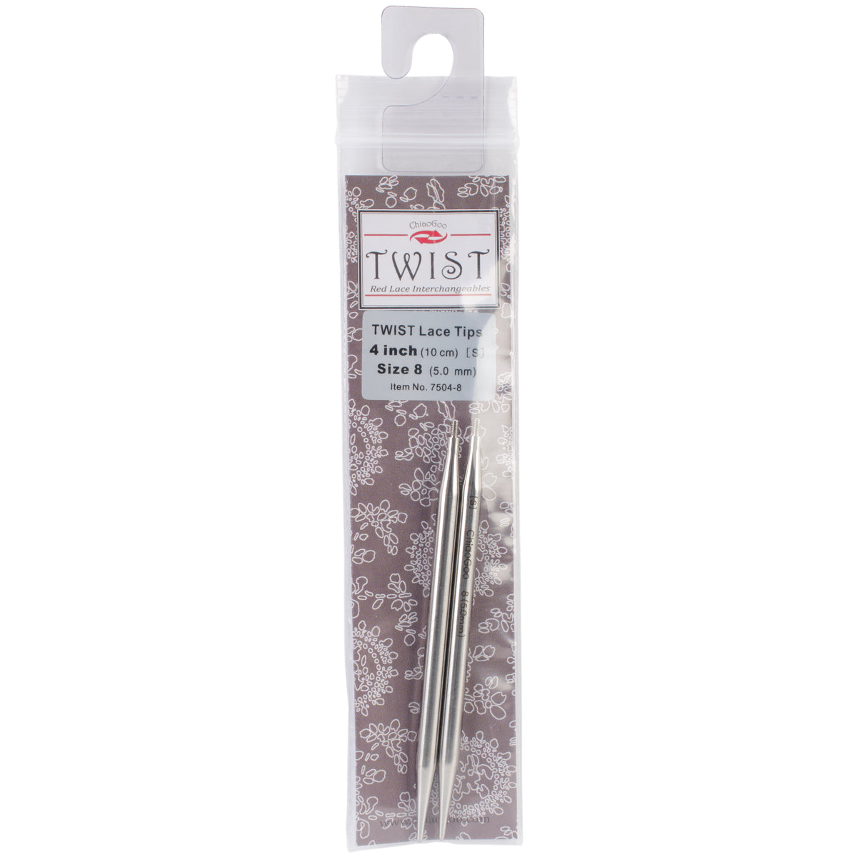 These ChiaoGoo precisely-machined, lace tips are made of surgical stainless steel. The size is laser imprinted on each tip. This package contains two 4 inch long interchangeable tips. Size: 8/5 mm. Imported.