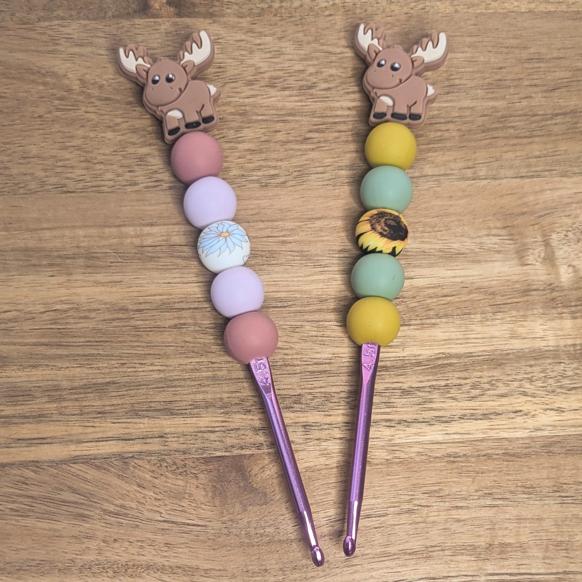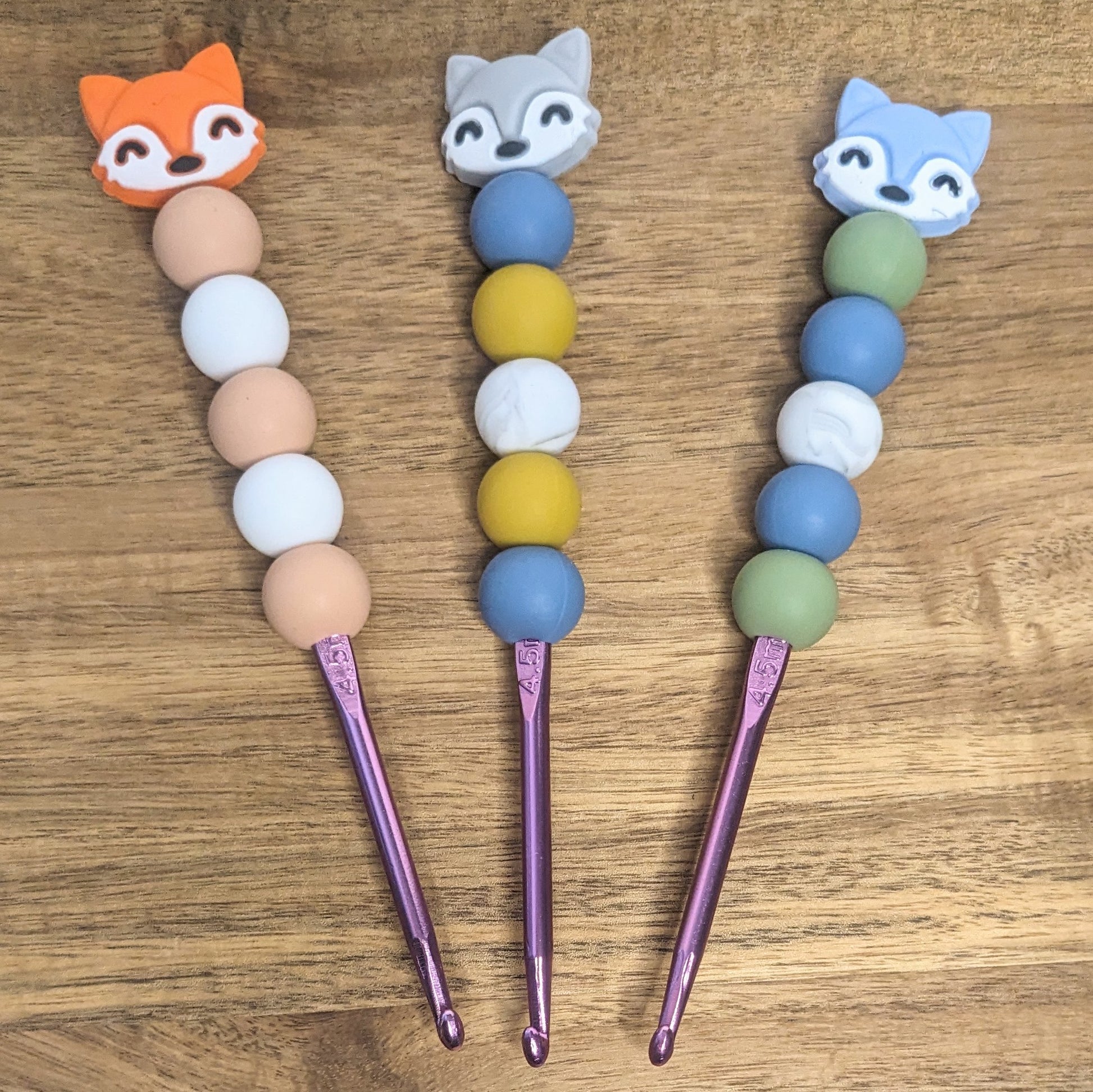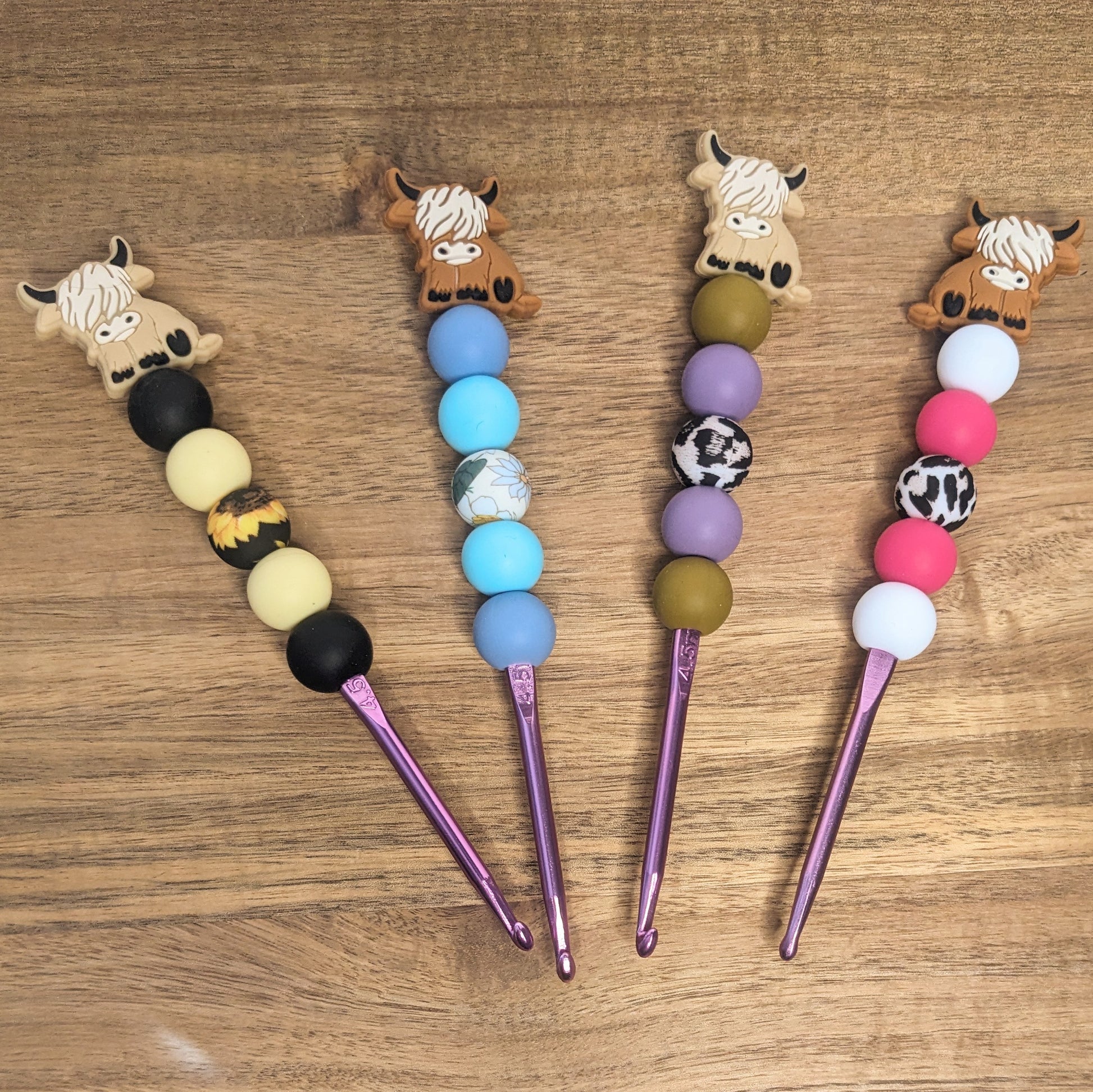 These 4.5 mm / 7 crochet hooks by A Little Charm Creations have 15 mm diameter silicone handles for a comfy grip. Hooks measure 6 to 6.25 inches in length.