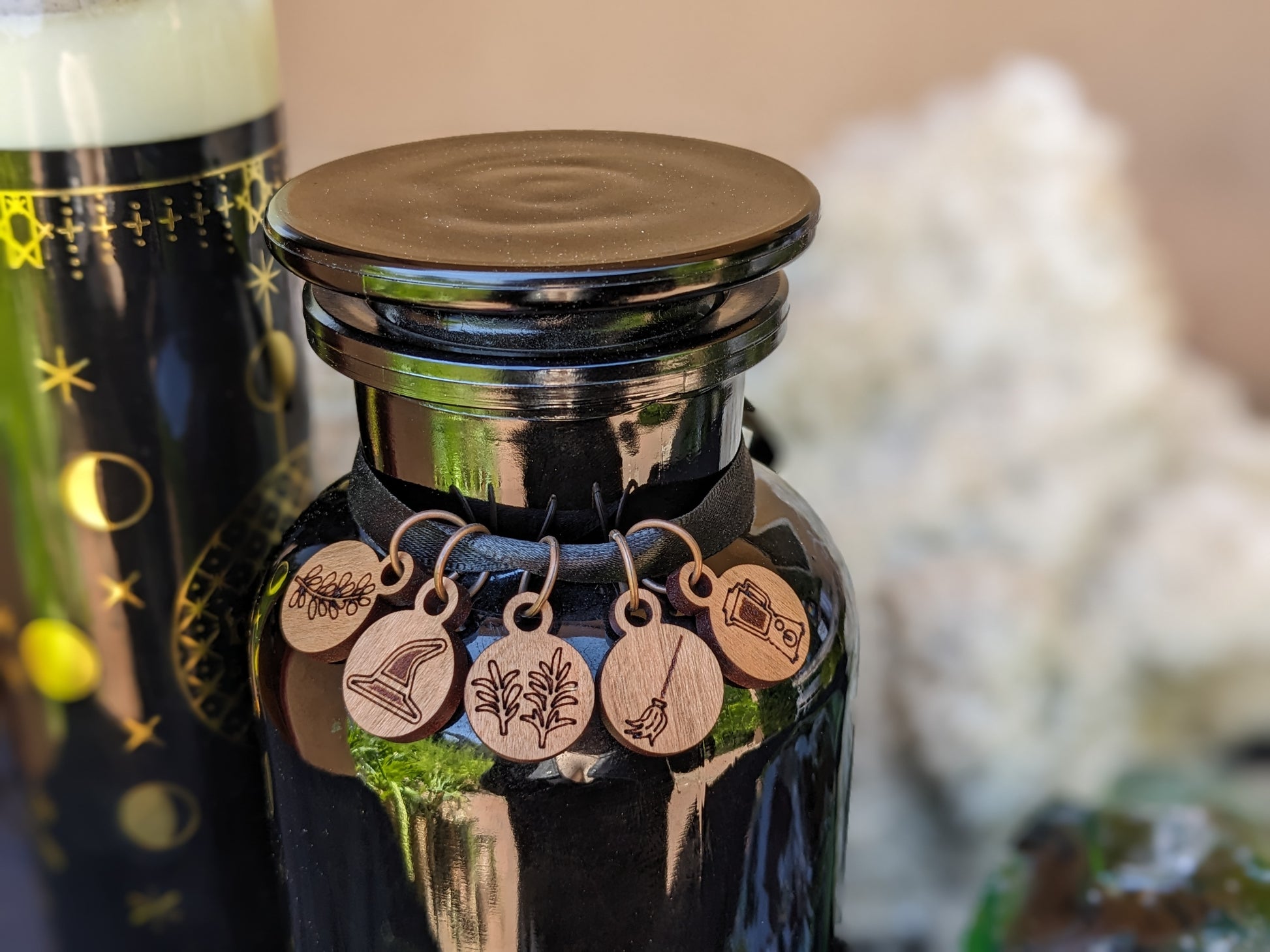 These stitch markers are a set of 5 laser cut cherry wood stitch markers measuring 13/16 inches tall and 5/8 inches wide. The silver jump ring is large enough for a US size 10 / 6 mm needle. The stitch markers picture rosemary, a witch's hat, lavender, a broom, and a blender full of midnight margaritas!
