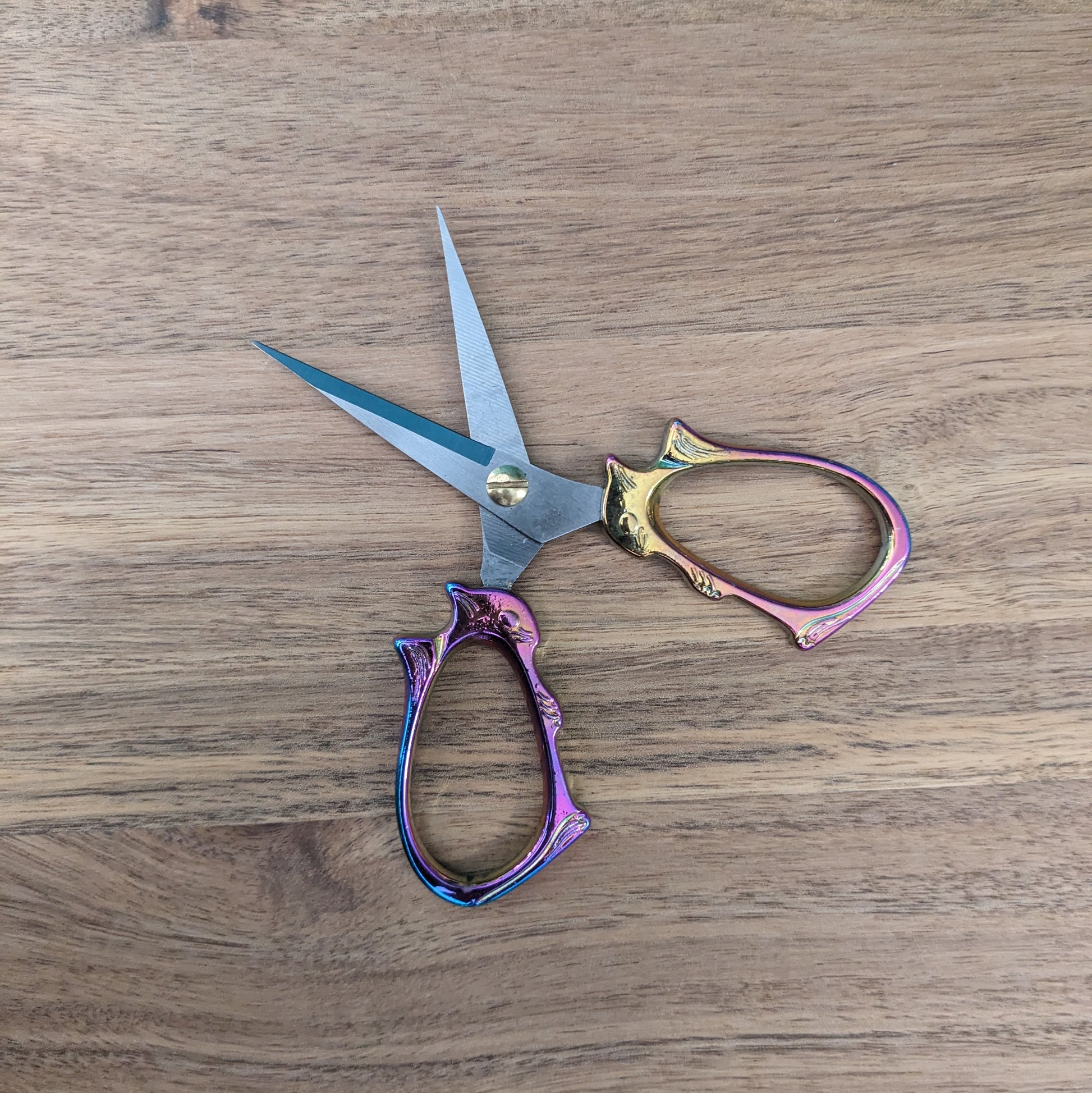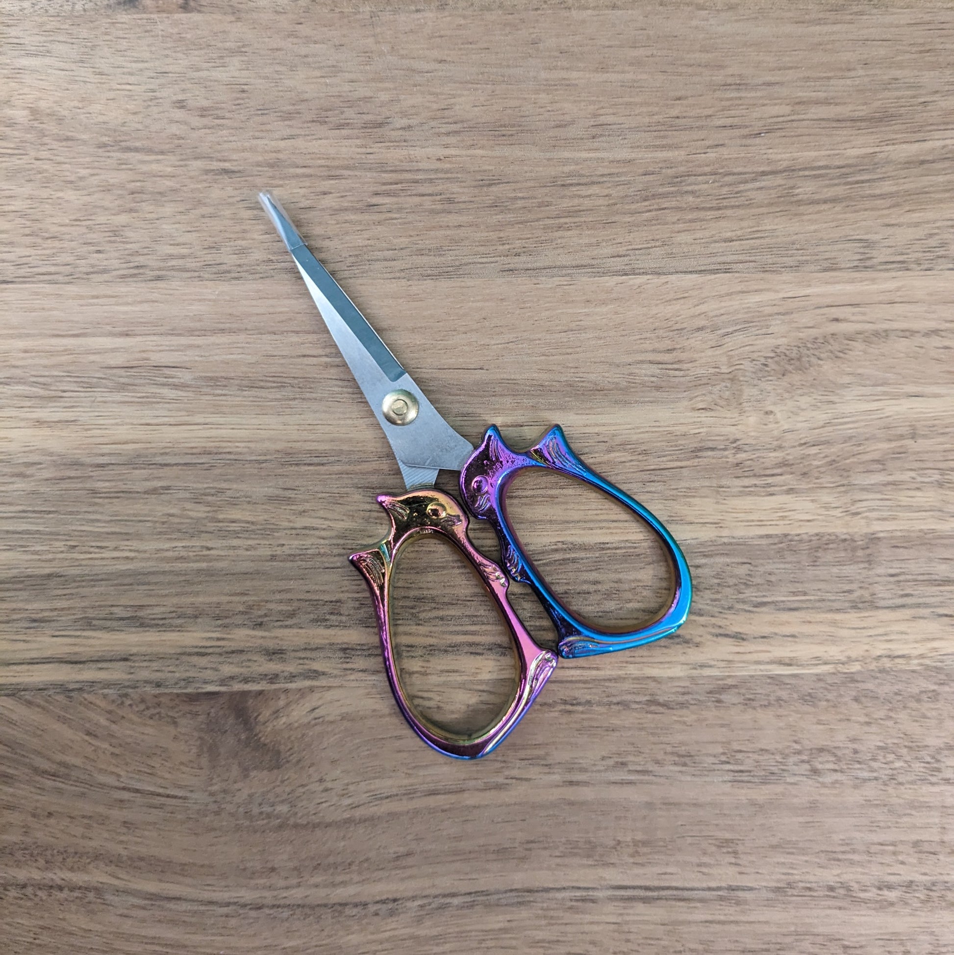 Practical Stitchcraft's rainbow squirrel scissors are sharp steel blades topped with a pair of anodized rainbow squirrels. They will be sent to you in a black box with padding.
