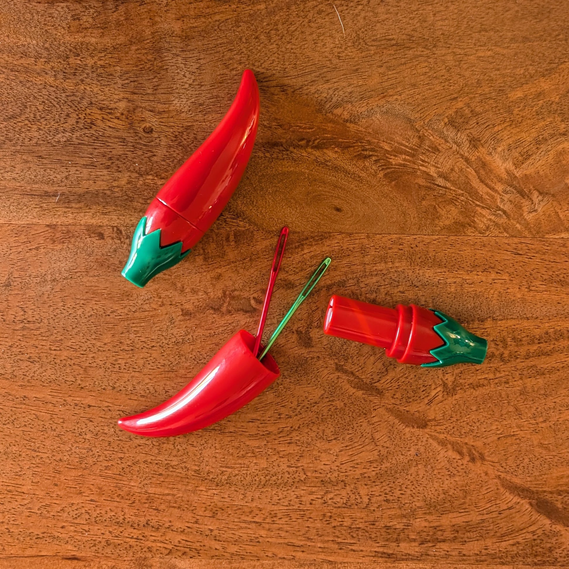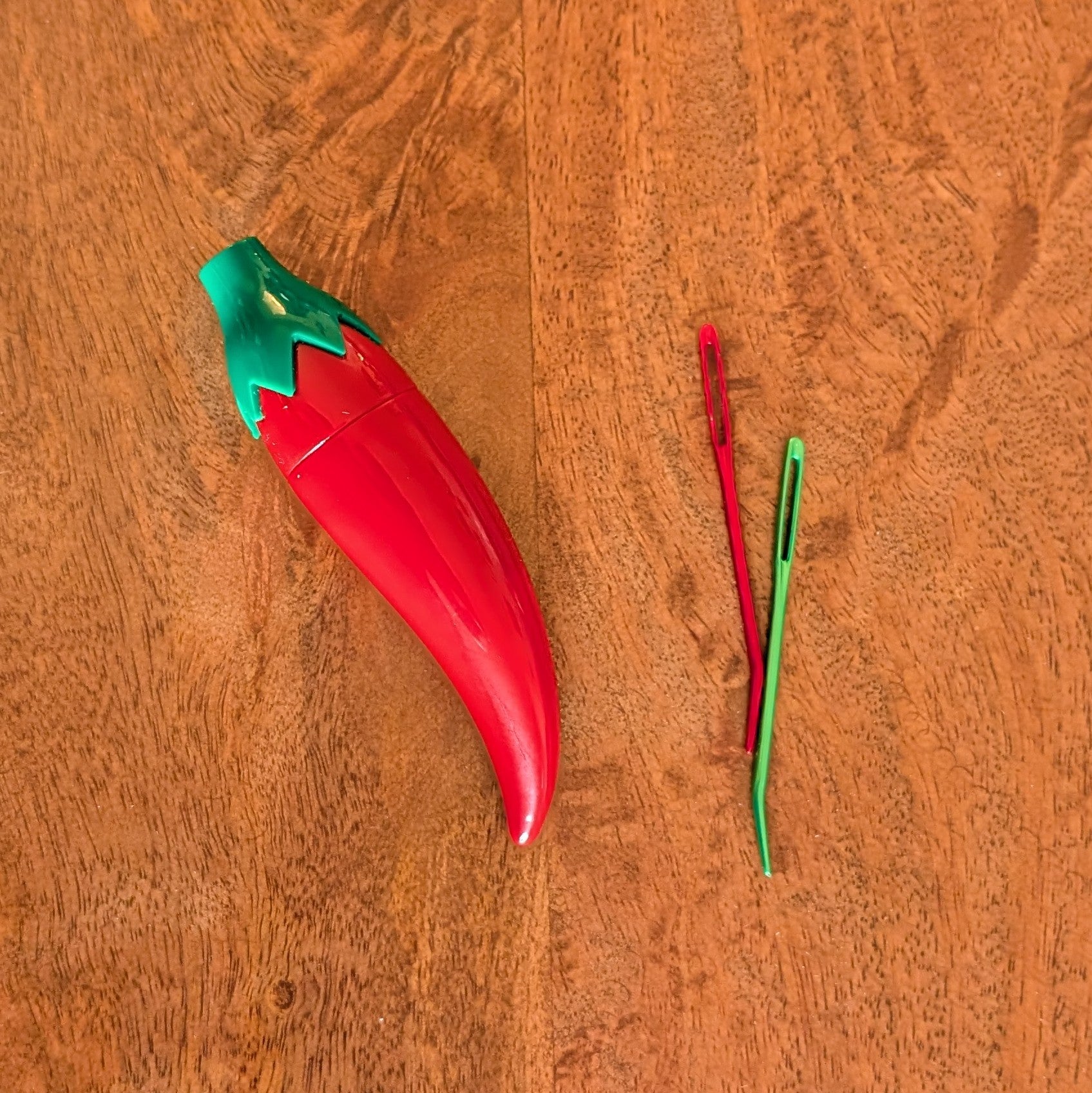 This adorable red chile needle case contains two 3 inch darning needles in red and green (New Mexicans, you know).