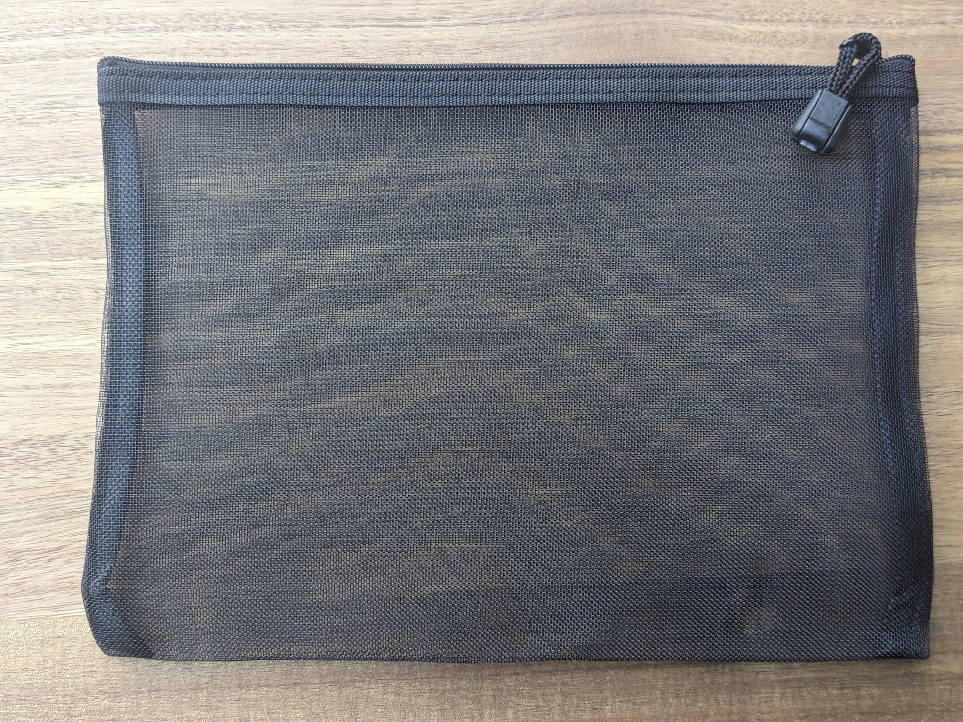 This light weight black mesh bag is perfect for small projects and notions. It has a black zipper closure.