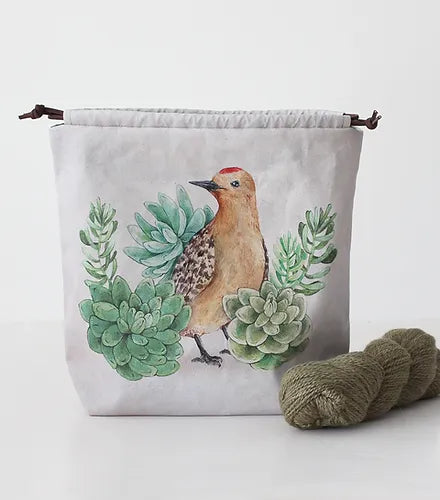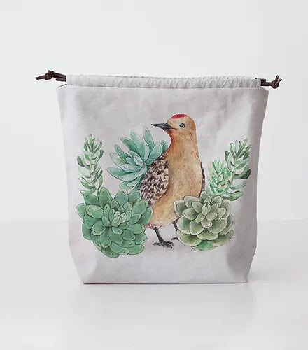 This handy drawstring project bag is made out of a printed unique illustration by The Blue Rabbit House. The design features a red-crowned woodpecker with his succulent plants illustration and is printed on 100% organic cotton.