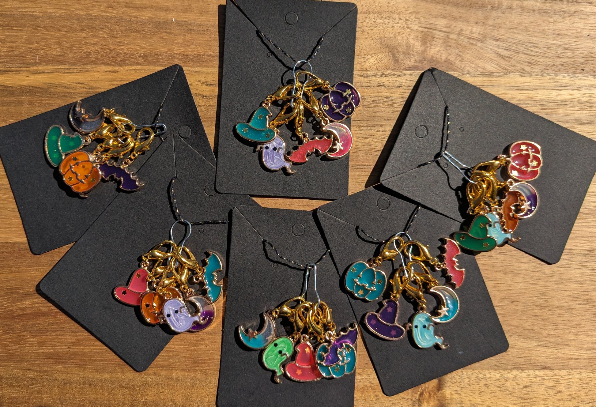 This is a set of 5 assorted enamel stitch / row markers in assorted pastel purple, pinks, teals, blues, greens, and orange ghosts, witch hats, bats, jack-o'-lanterns, and crescent moons. Colors will be chosen at random.