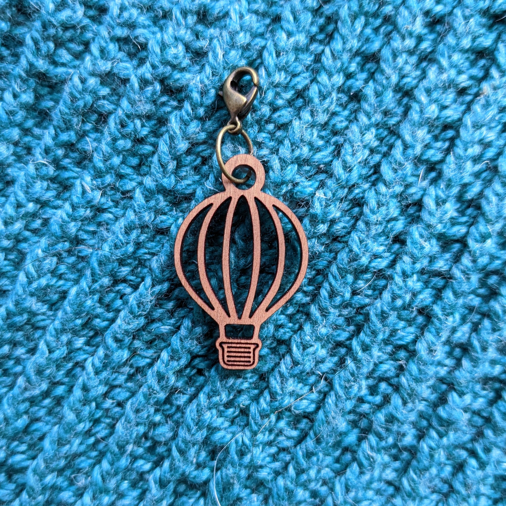 The charm is laser cut cherry with a antique brass lobster claw suitable for both knit and crochet projects! The charm is 1.25 inches high and 0.75 inches wide. With the lobster clasp the hot air balloon charm is 1.75 inches long.