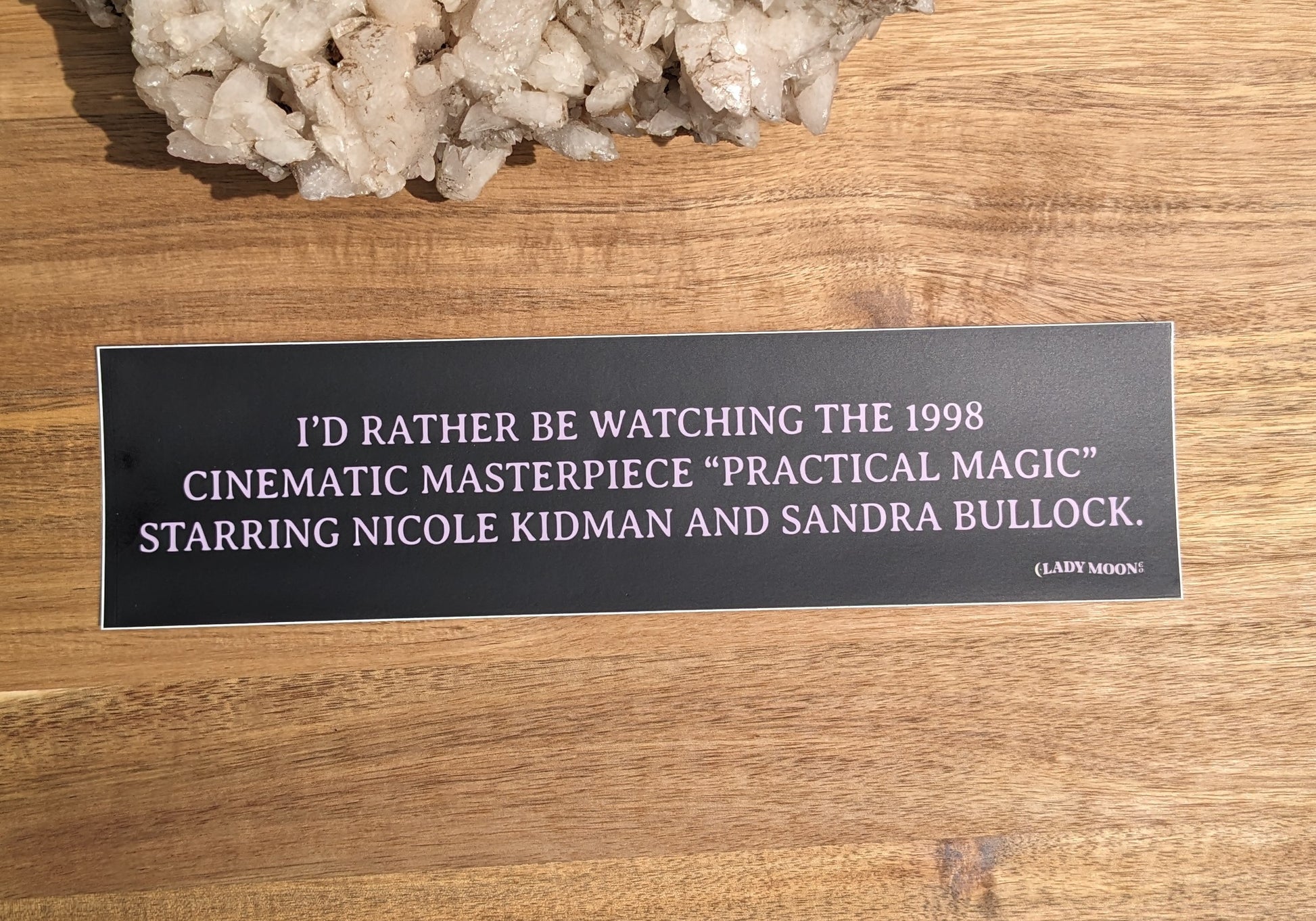 These matte black bumper stickers have the words "I'd rather be watching the 1998 cinematic masterpiece "Practical Magic" starring Nicole Kidman and Sandra Bullock." in pale ink. In the bottom right hand corner is Lady Moon Co 's logo. The sticker measures 3 inches by 11.5 inches.