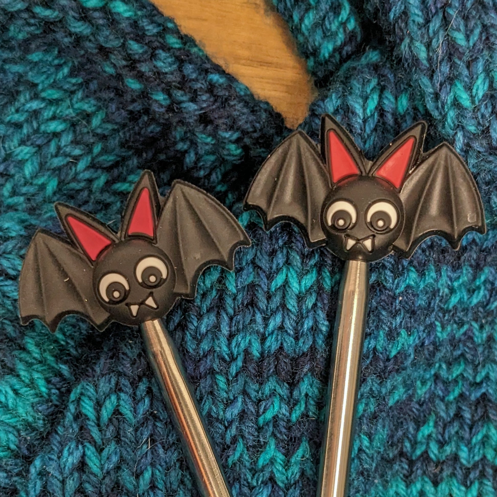 These black frickin' bat needle stoppers can be used on knitting needle US size 2 to 15 (2.75 to 10mm) needles. They are made from silicone, measure 1 inch tall and 1.5 inches across, and come as a pair.