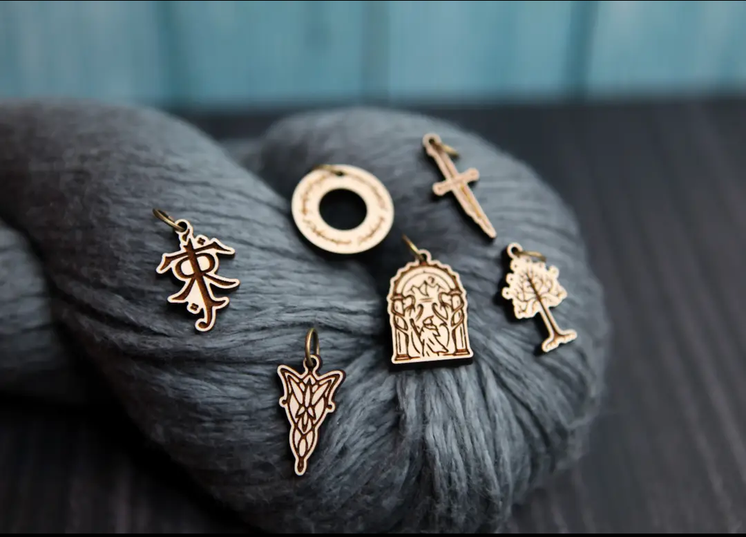 These 6 stitch markers pay homage to Tolkien's masterpiece with Tolkien's signature, the one ring, the shard of Narsil, the tree of Gondor, the doors of Durin, and the Evenstar pendant.
