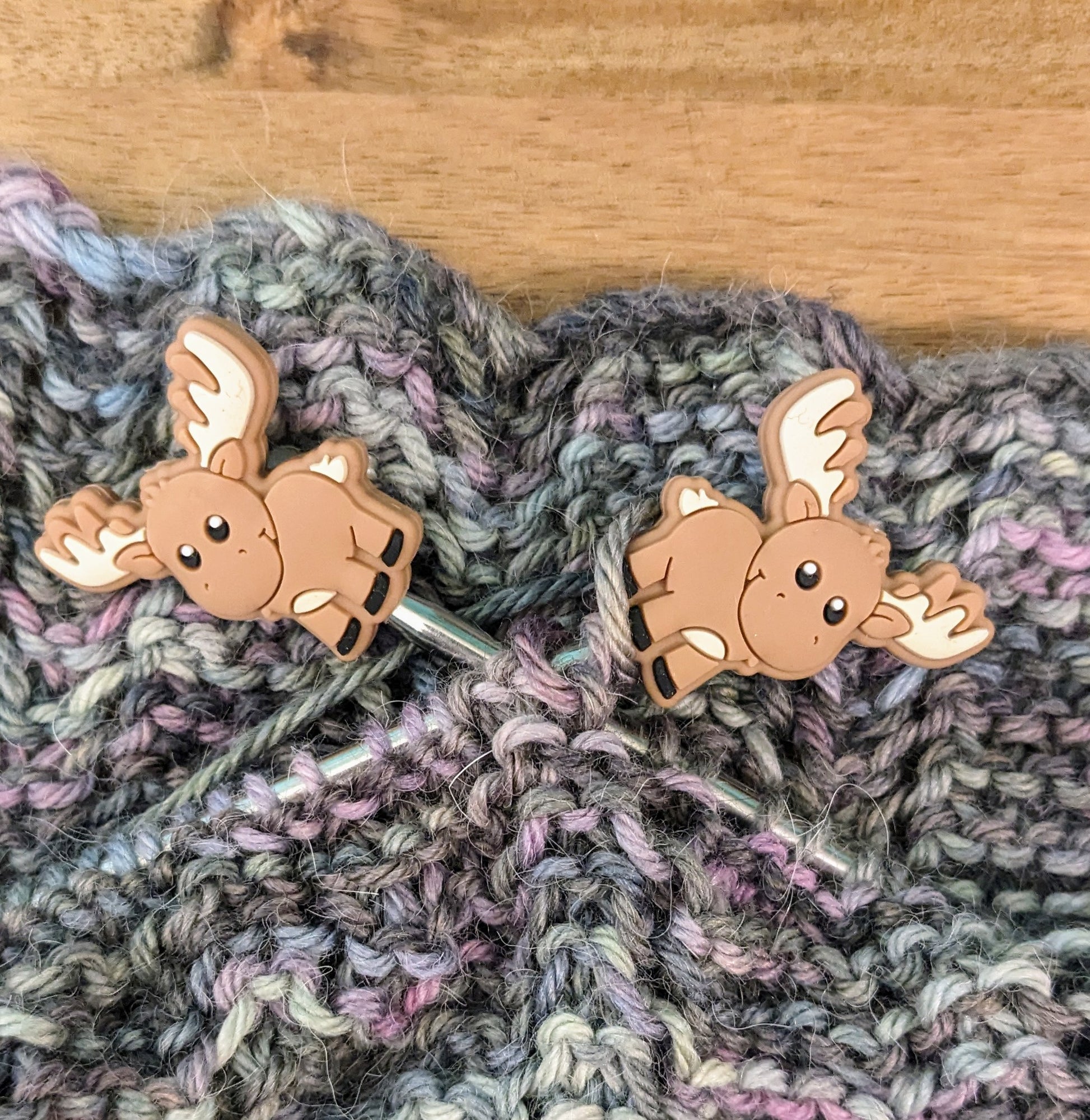 Marty the Moose needle stoppers can be used on knitting needle US size 2 to 15 (2.75 to 10mm) needles. They are made from silicone, measure 1 inch tall and 1 inch across, and come as a pair.