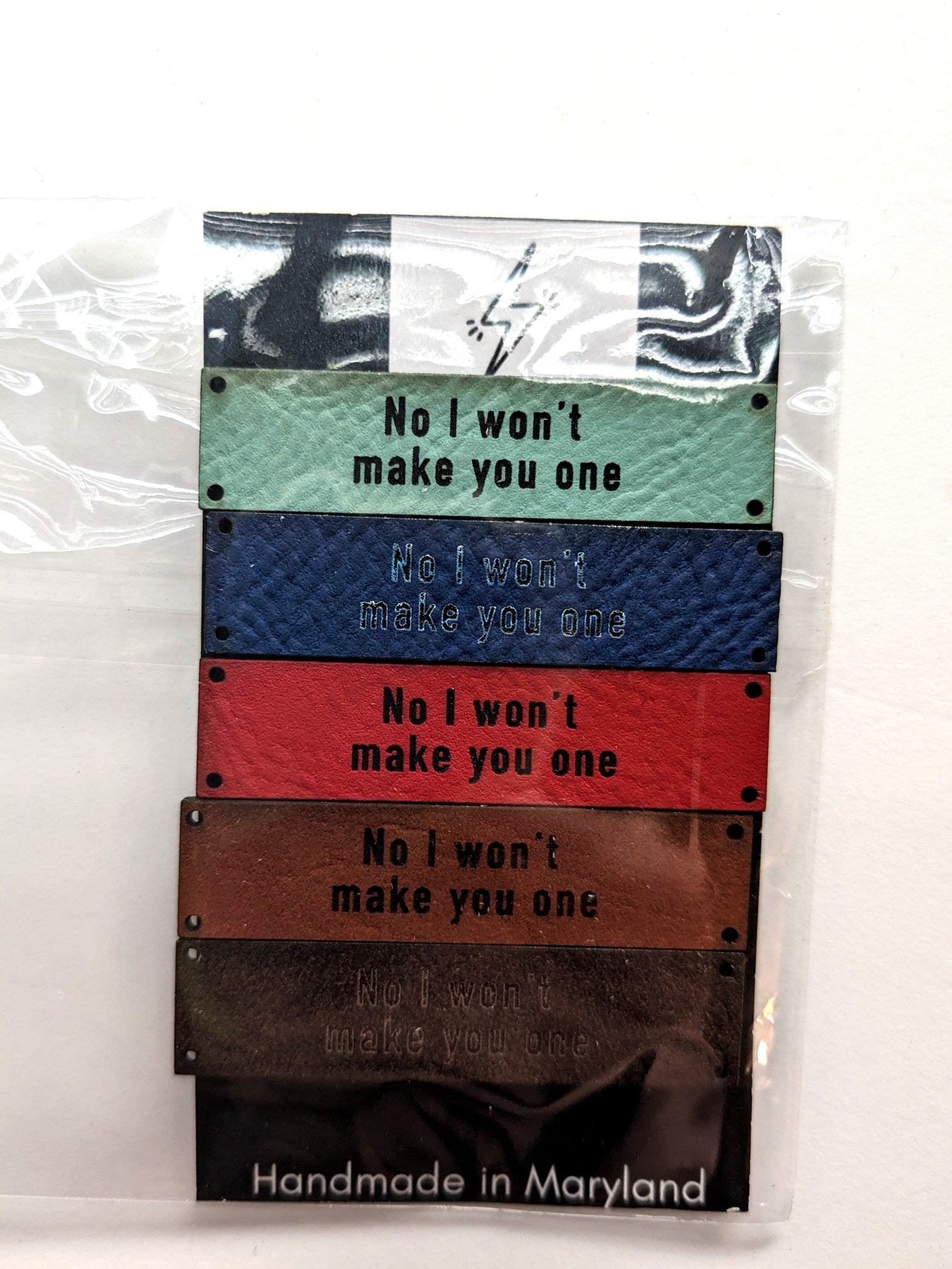 This collection of 5 vegan leather labels include 1 mint, 1 blue, 1 red, 1 brown, and 1 black that are engraved with the statement "No I Won't Make You One."