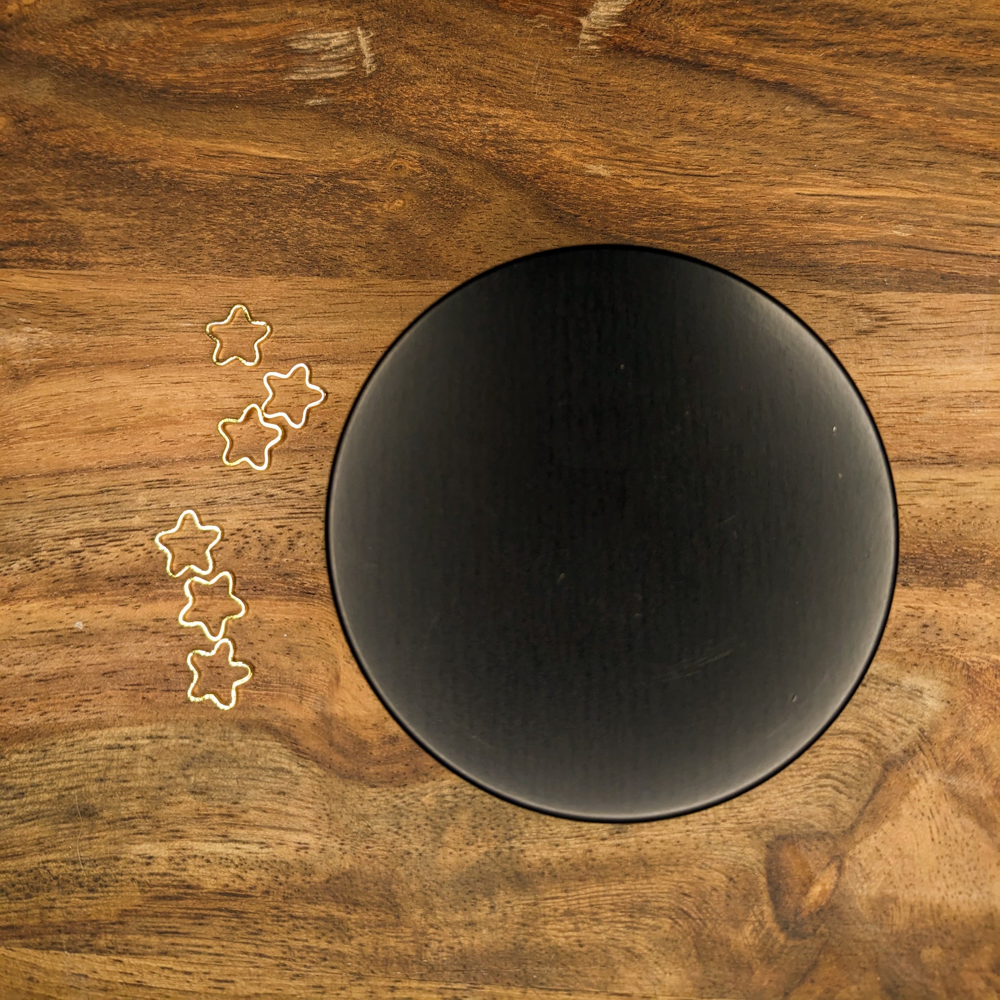 These stitch markers are a set of 20 gold rounded (so you don't get stabbed) star stitch markers which are large enough for a US size 8 / 5 mm needle.  They are housed in a matte black aluminum screw top tin which measures 2.5 inches in diameter.