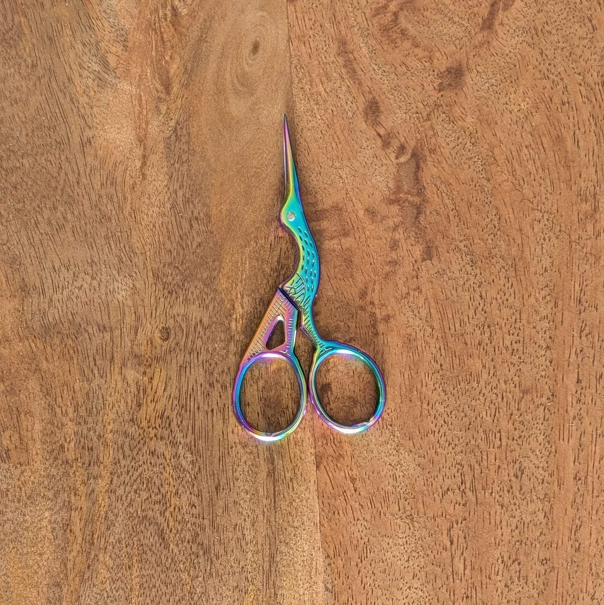 Practical Stitchcraft's rainbow crane scissors are sharp steel blades topped with an anodized rainbow crane.