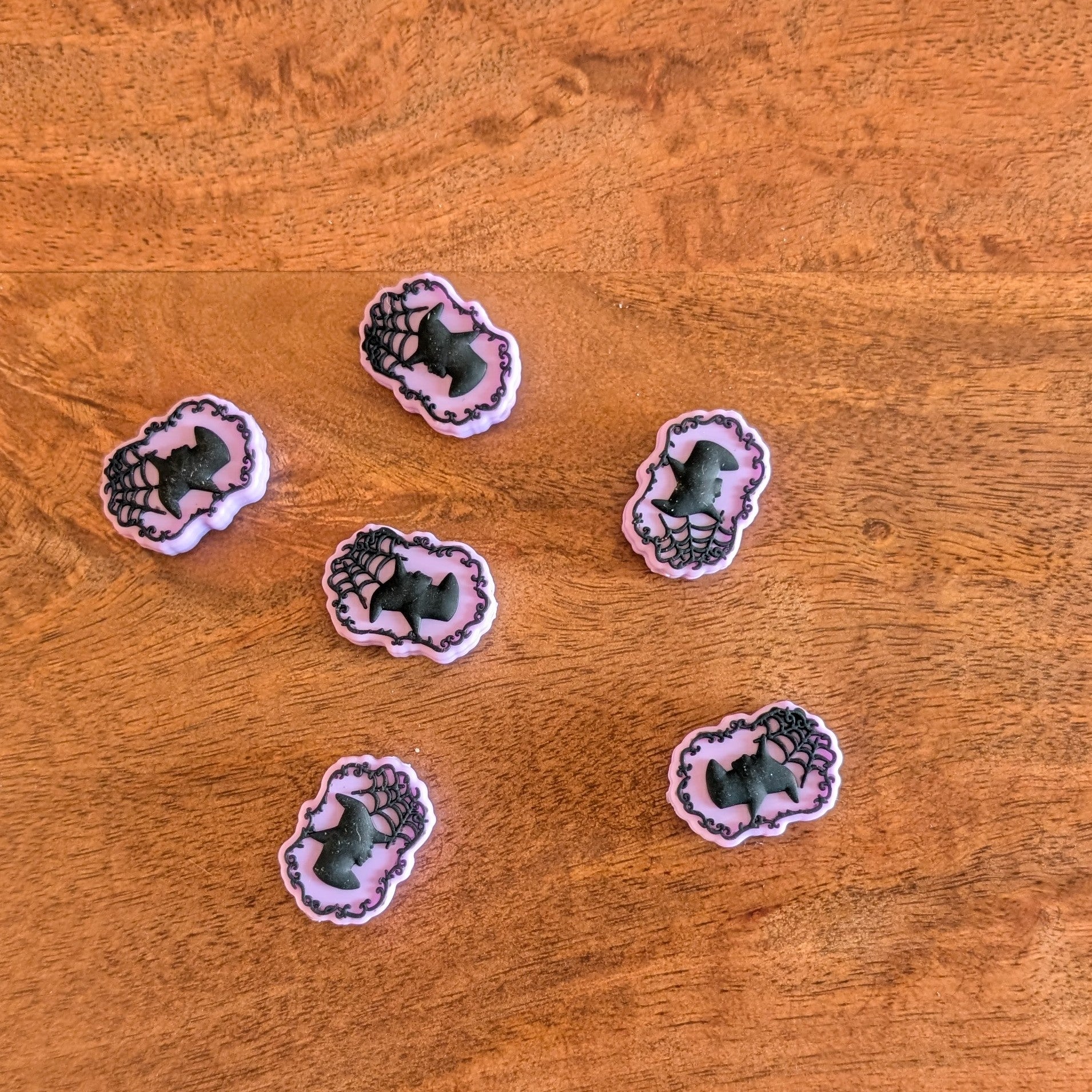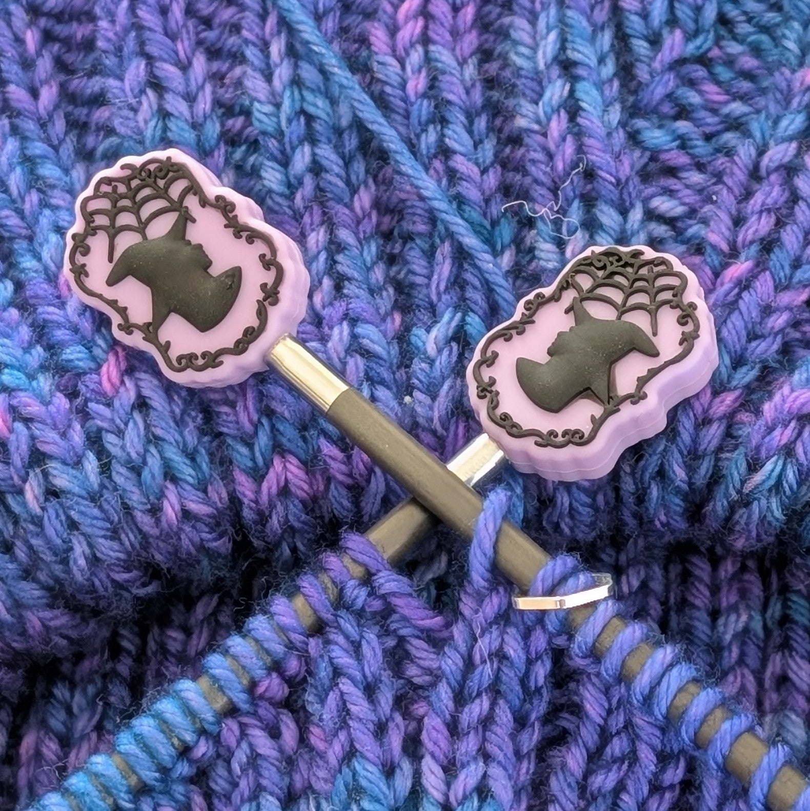 The lavender and black Resting Witch face needle stoppers can be used on knitting needle US size 2 to 15 (2.75 to 10mm) needles. They are made from silicone, measure 1 inch tall and 0.75 inches across, and come as a pair.