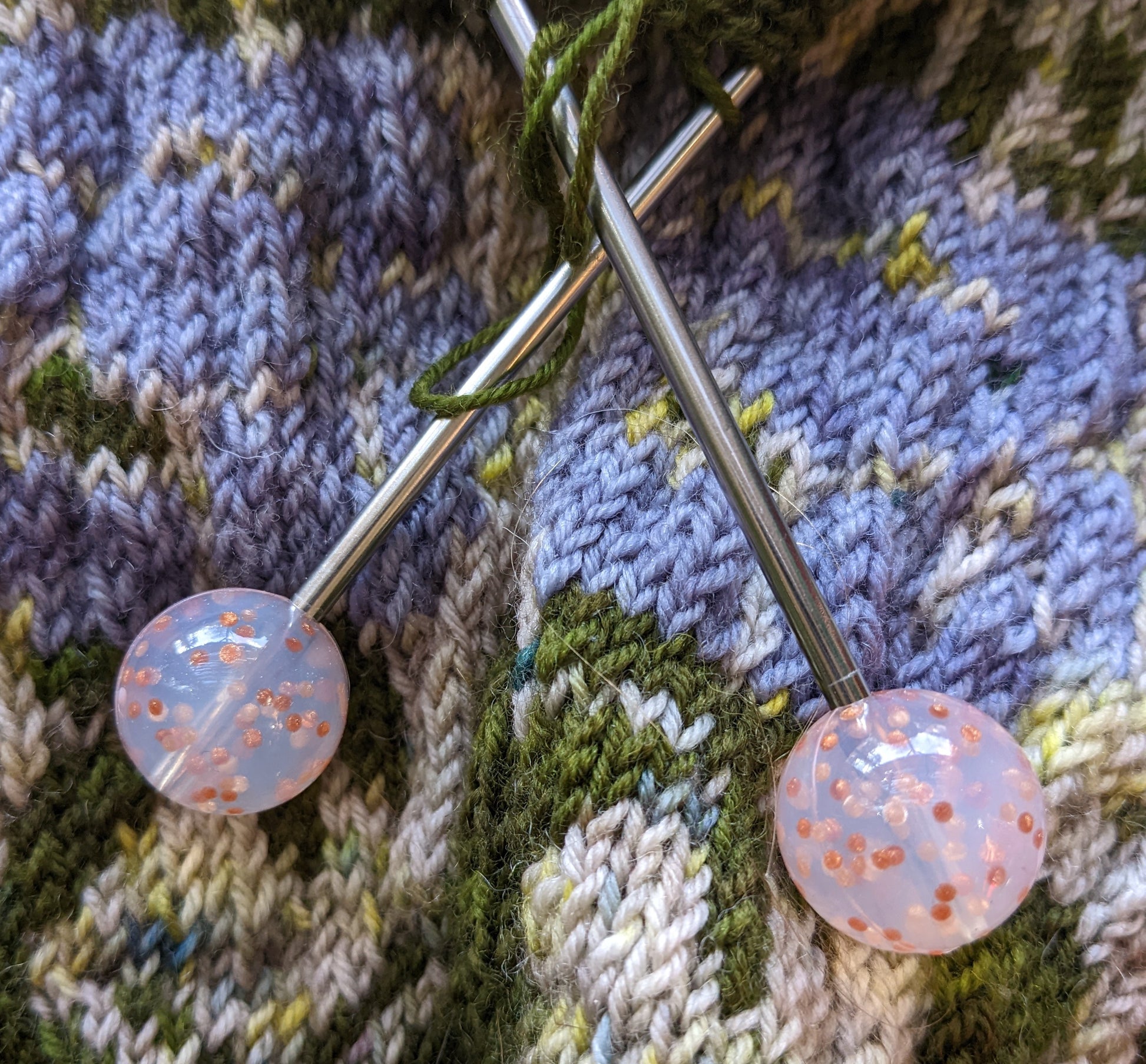 These spherical translucent needle stoppers contain bright specks of rose gold color and can be used on knitting needle US size 2 to 15 (2.75 to 10mm) needles. They are made from silicone, measure 17mm across, and come as a pair.