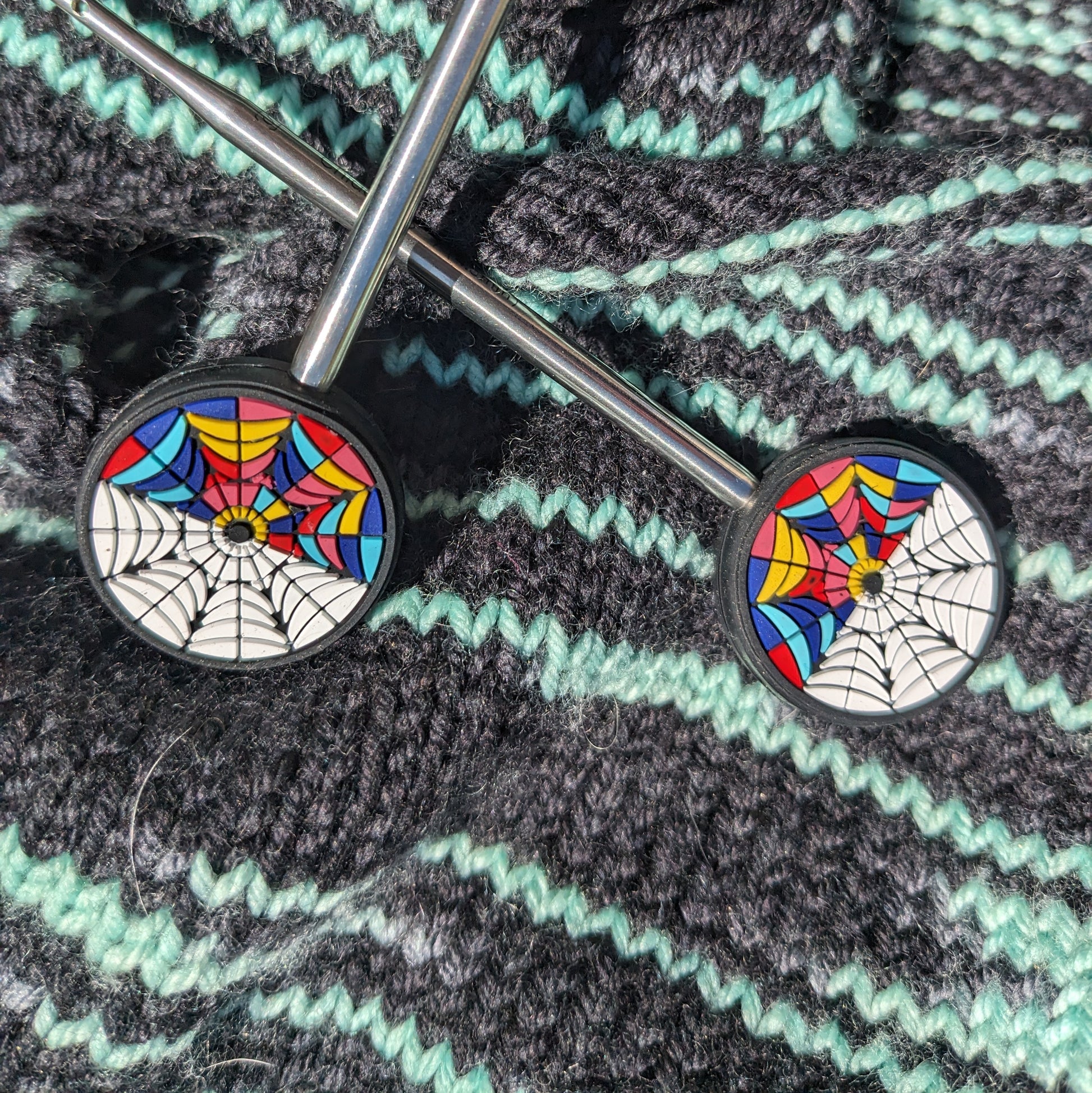 The multicolor stained glass spider web needle stoppers can be used on knitting needle US size 2 to 15 (2.75 to 10mm) needles. They are made from silicone, measure 1 inch in diameter, and come as a pair.