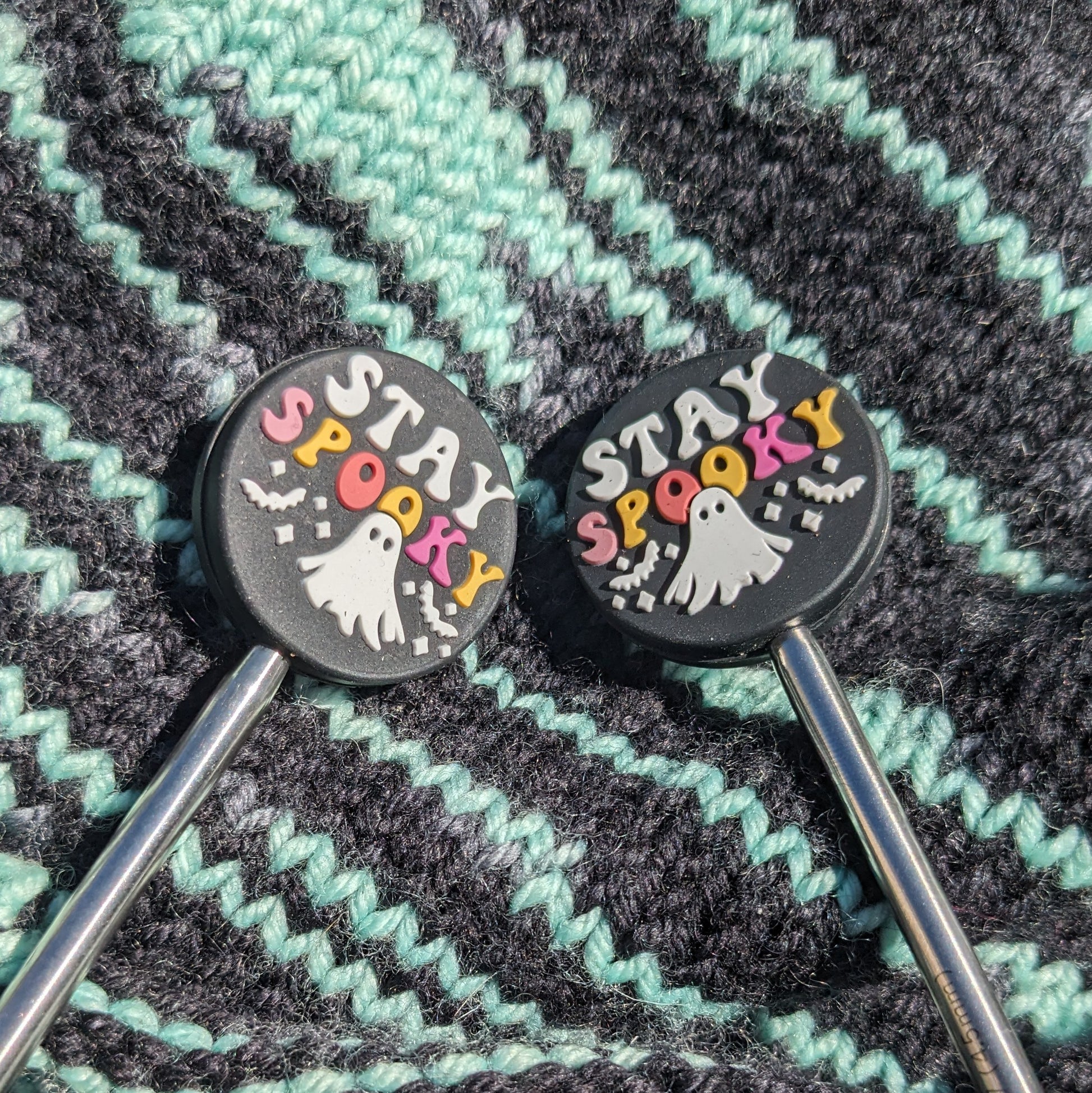 The Stay Spooky needle stoppers can be used on knitting needle US size 2 to 15 (2.75 to 10mm) needles. They are made from silicone, measure 1 inch in diameter, and come as a pair.