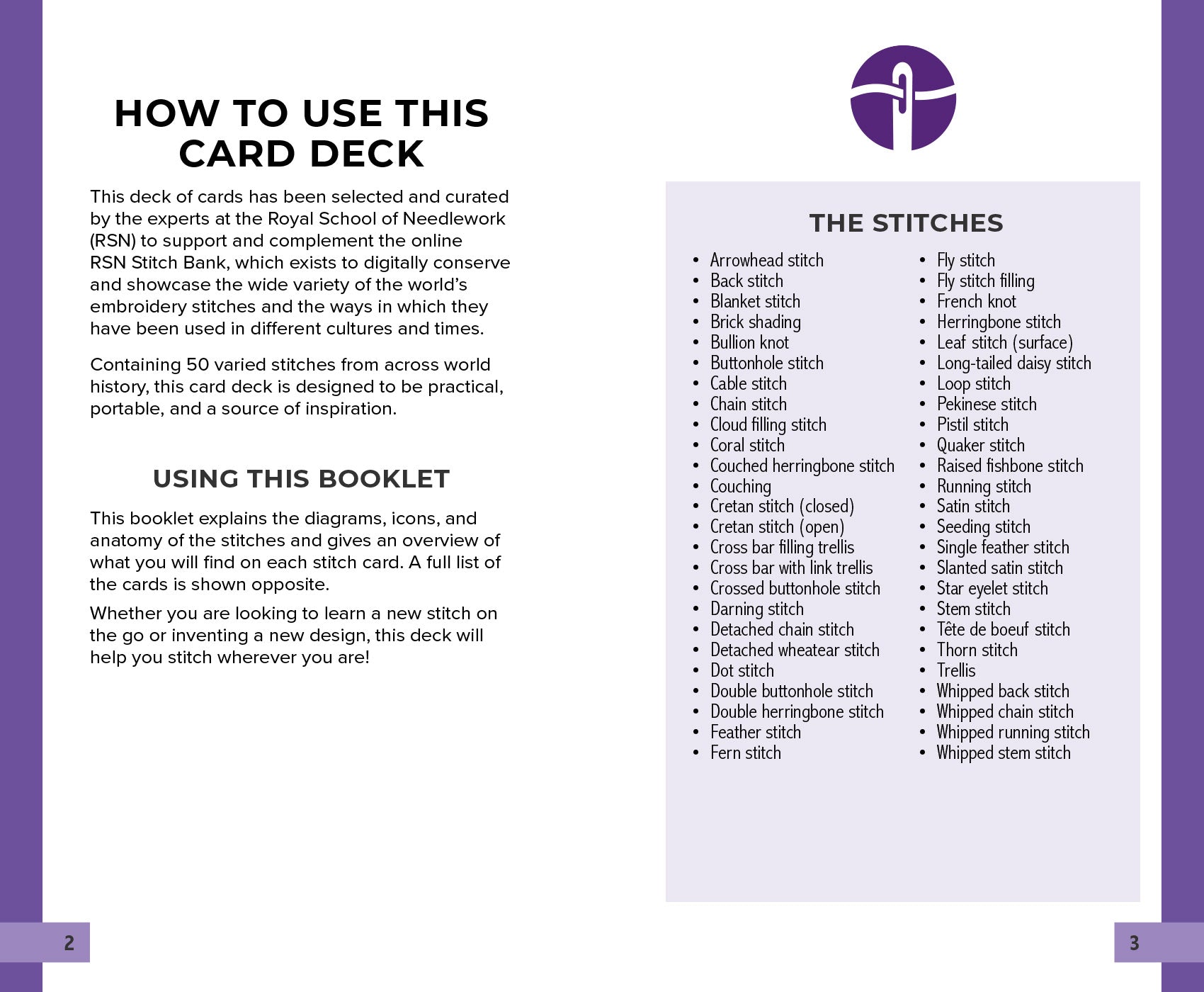 • a 16-page booklet packed with the essential embroidery know-how you need to get started, from beginner tips to expert techniques, along with a brief historical overview of the RSN’s rich history.
