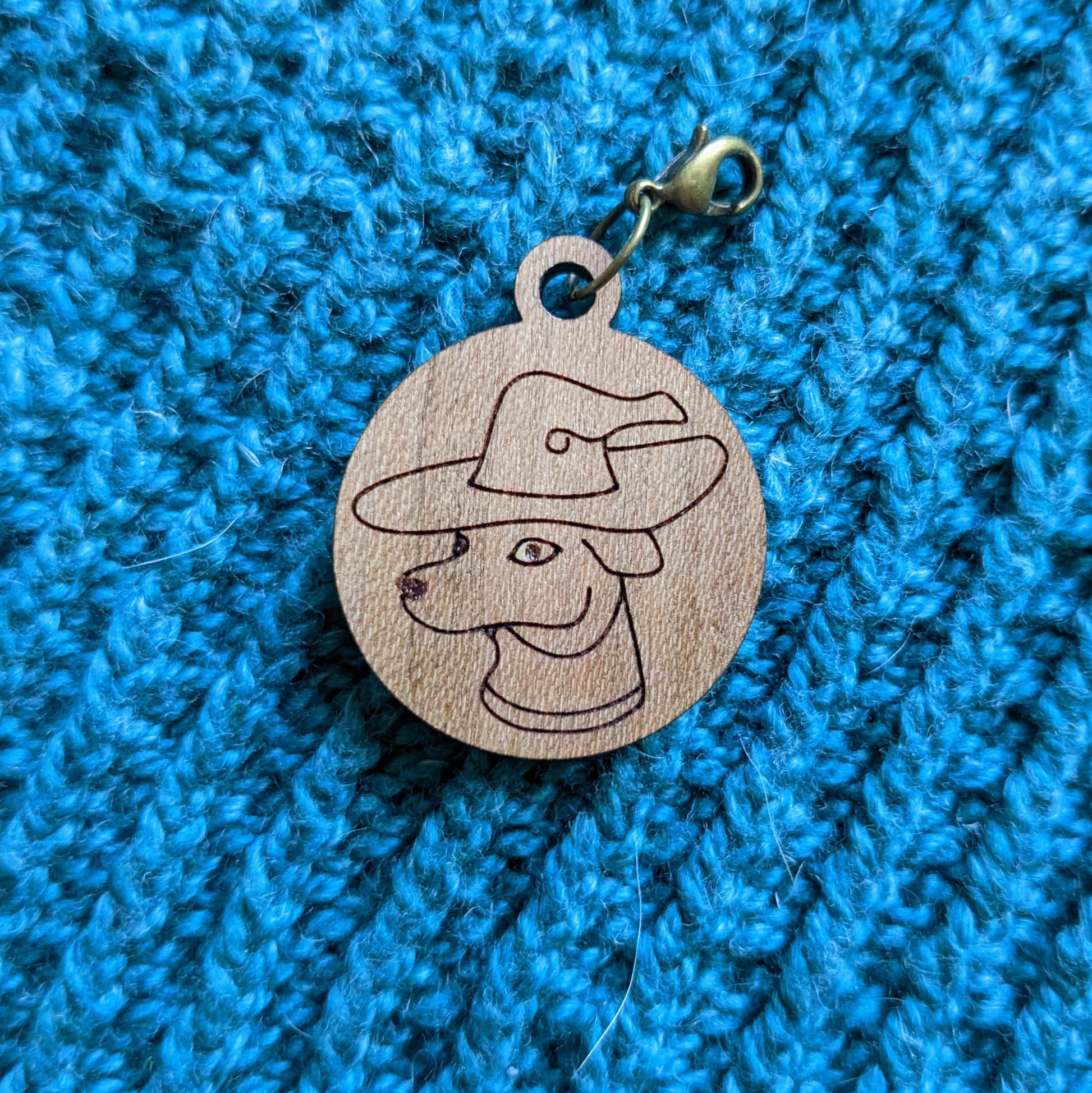 The charm is laser cut cherry with a antique brass lobster claw suitable for both knit and crochet projects! With the lobster clasp the Zuzu charm is 1.75 inches long and the jump ring will fit up to a US 10 / 6 mm needle.